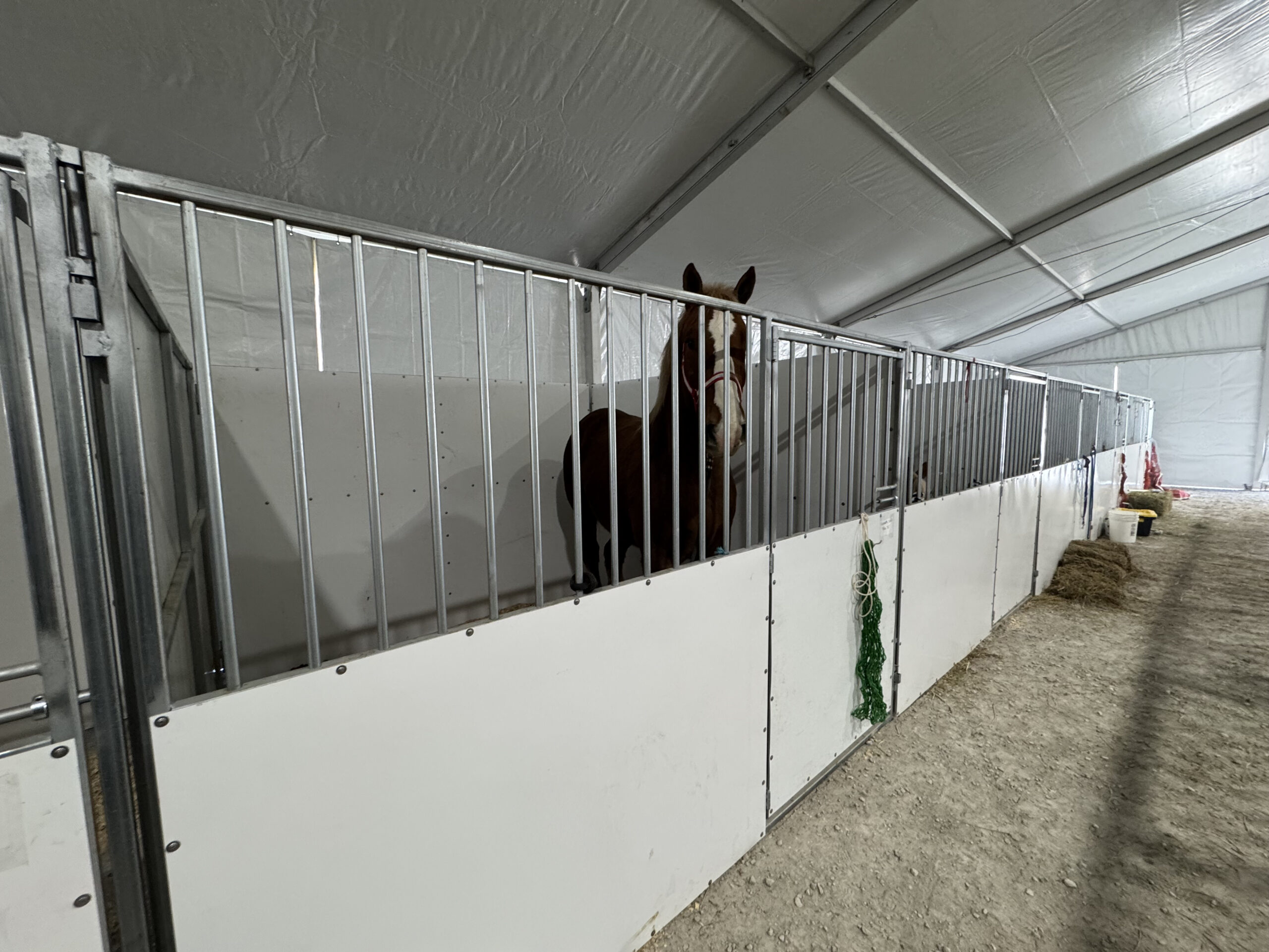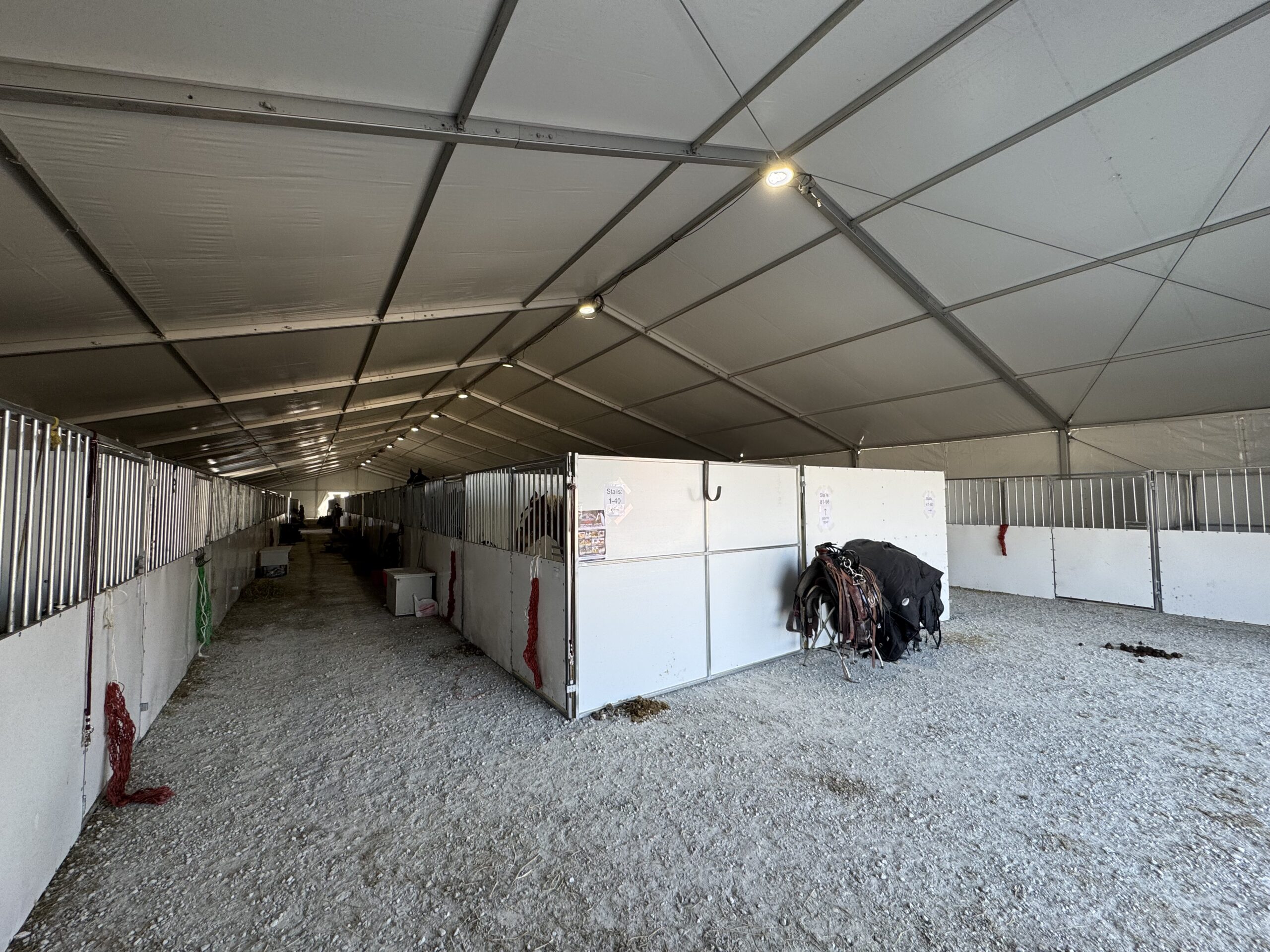We outfitted them with full white PVC sidewalls for wind and weather protection, plenty of bright LED high-bay UFO lighting to keep the action visible from dawn to dusk, heavy-duty power extensions, and all the pro setup support needed (including reach lifts for safe install/tear-down). The result? A spacious, well-lit covered arena perfect for spectators, exhibitors, and those impressive horse parades – no matter what Mother Nature threw our way.