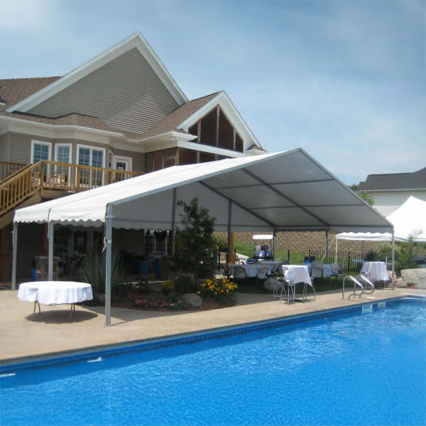 This tent is great for wedding ceremonies and receptions, corporate events, reunions, festivals or parties. This 800 sq ft structure has no center poles which leaves you with an impressive and completely open floor plan that you can fully utilize. This event structure can be erected on grass, asphalt/pavement or concrete. This temporary structure is perfect for table-seated events with a guest list of 64-80 people. Heating and/or air conditioning is available for this structure. Dress up your event space with sidewalls in various styles, glass doors, porch and lighting.