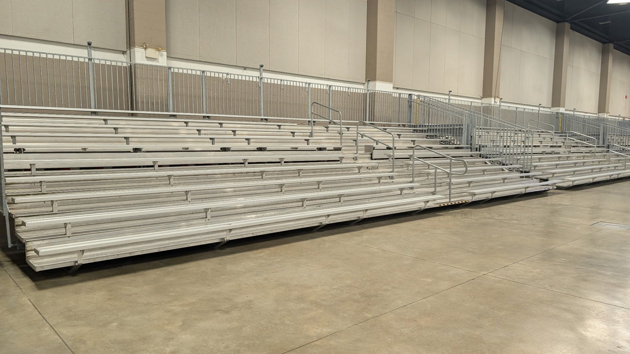 • Built tough for safety and high-traffic crowds — Galvanized guardrails, robust I-beam steel frame, aluminum seats and walk boards, plus full compliance with safety standards for athletic venues.